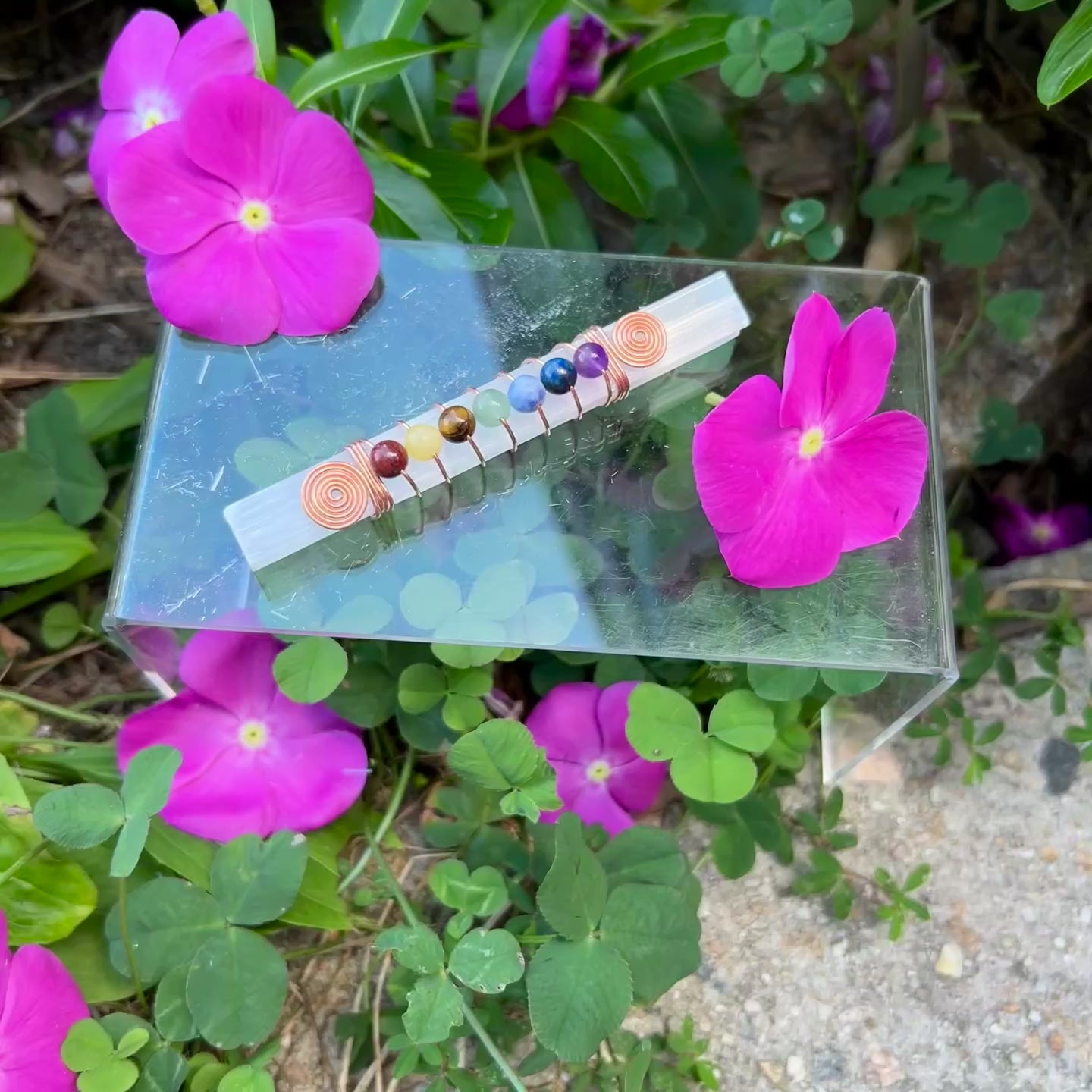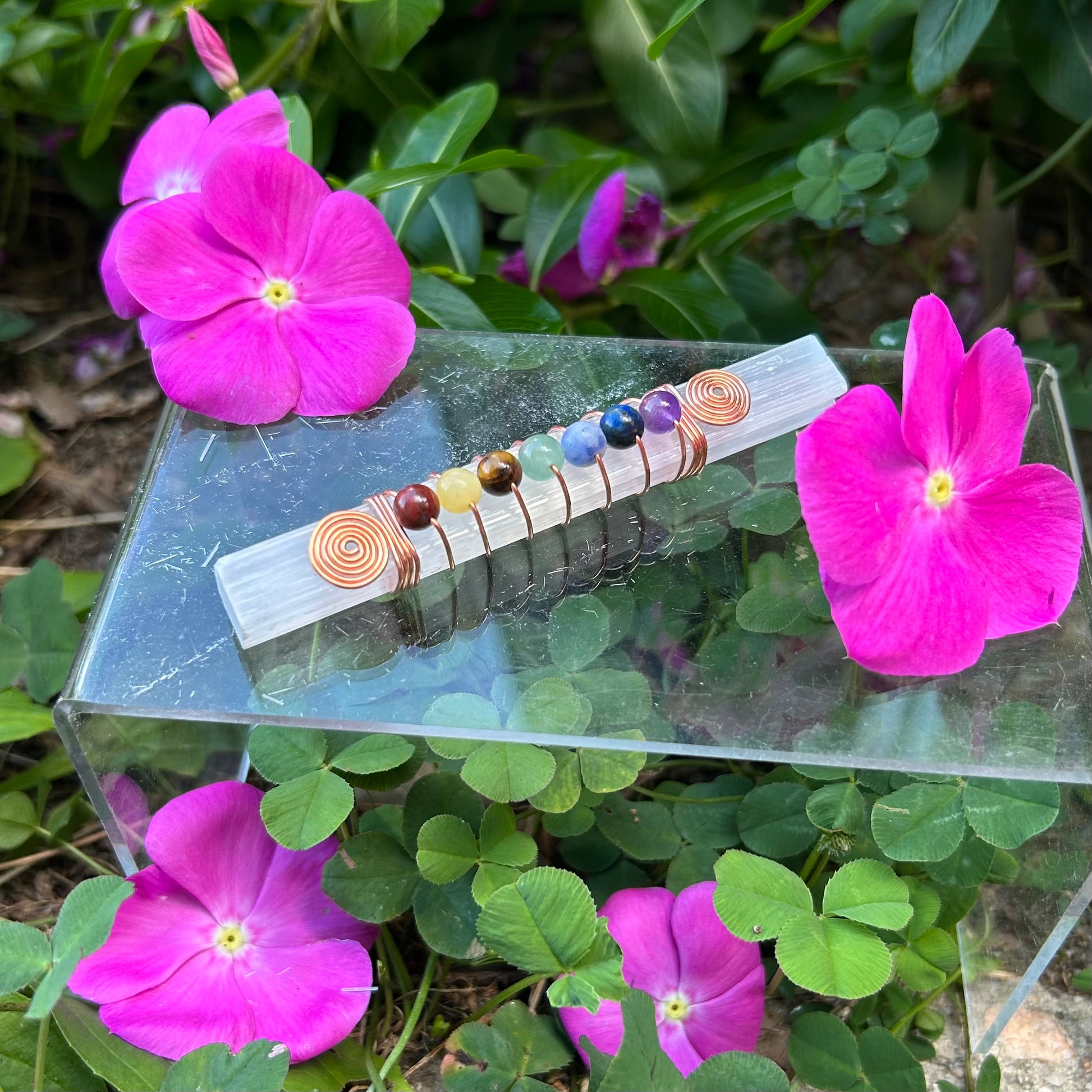 Each of these Chakra Balancing Selenite Wands are handcrafted with 99.9% Pure Copper and Genuine Gemstone Beads on and 4" piece of Selenite.